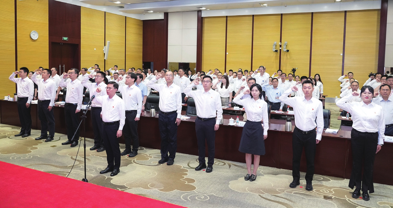 会场内,主席台电子屏上10面鲜艳的红旗分列两侧,簇拥着高悬中央的金色党徽。全体与会党员神情庄严、精神昂扬,胸前佩戴着闪亮的党员徽章。